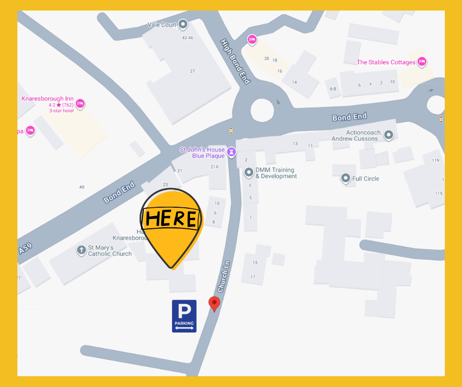 Directions - turn down Church Lane from Bond End (just before the mini roundabout if you are travelling up the hill). Keep going until you see a large iron gate, but before going through the gate turn right into a small car park. Walk around the right side of the Old School building until you see an iron fence, go through the small gate and use the grey door to the left of the large windows.
